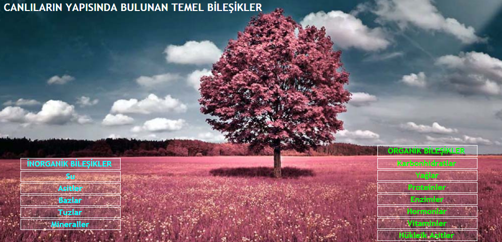 Temel bileşenler birleşerek tüm canlıları oluşturur. İnorganik ve organik bileşenlere ayrılır.