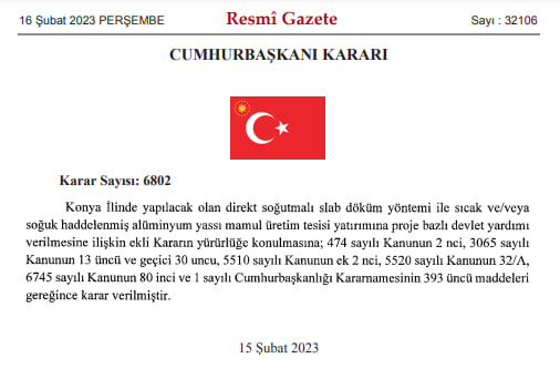 Deprem bölgesine bağış kapsamında dün gece yaptığı “3 milyar liralık bağış” ile teklifte bulunan Cengiz Holding, güne büyük bir devlet teşvik paketiyle uyandı. Cengiz Holding’in sahibi olduğu Eti Alüminyum’un Konya’da yapacağı yassı alüminyum ürünleri üretim tesisi için büyük miktarda teşvik aldı. Cumhurbaşkanı Recep Tayyip Erdoğan’ın imzasıyla bugün Resmi Gazete’de yayımlanan kararnameye göre teşvik 5 yıl, gerekirse 2,5 yıl daha verilecek.
