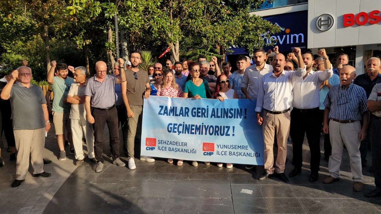 Manisa’da CHP Yunusemre ve Şehzadeler İlçe Başkanlığı ortaklaşa şunları söyledi: “Zamları geri getirin. Her gün iğneden ipliğe gelen zamlara tepki göstererek 15 Temmuz’da Demokrasi Meydanı’nda ‘Anlaşamıyoruz’ pankartı ile basın açıklaması yaptı. Manisa CHP ilçe başkanı İsmail Çalışkan, eski CHP Manisa ilçe başkanı Semih Bilalan, Yünsemry, Şehzadler ilçe teşkilatları, gençlik kolları ve alef katıldı. Açıklamaya dehşete kapılan kadınlar, parti üyeler.