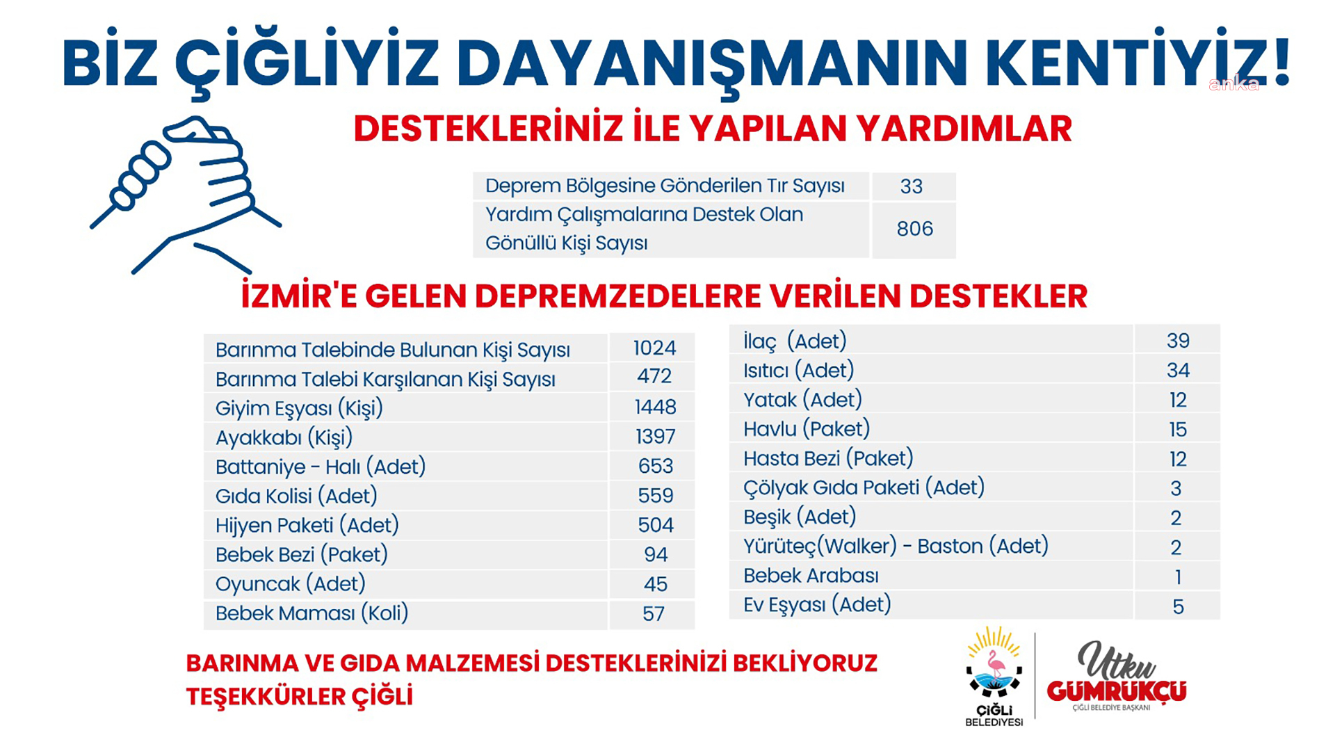Başkan Utko Gumruko’nun davetiyle başlayan dayanışma seferberliği, Çiğli’li işadamları, tüccarlar, STK’lar, dernekler ve vatandaşların katkılarıyla hız kesmeden devam etti. Çiğli Belediyesi Deprem Koordinasyon Merkezi tarafından düzenlenen ve 806 vatandaş gönüllünün desteğiyle düzenlenen etkinlikler kapsamında gıda, giyecek, ilaç, yakacak vb. Malların taşınması için 33 dayanışma TIR’ı gönderildi.