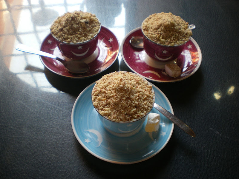 Kahve köpüğü üzerine serpilen bademler servis sırasında fincanın yanında bırakılan küçük kaşıkla yenir ve ardından fincandaki kahve içilir. Badem tadında köpüklü içilen kahve her zamanki gibi kırk yılın hatırası. Kahvenin yanında ikram edilen küçük lokumlar da işin eğlenceli tarafı tabii ki.