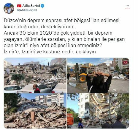 Cumhurbaşkanı Recep Tayyip Erdoğan’ın 5.9 büyüklüğündeki depremin vurduğu Yerel Haberler’yi “halk hayatını etkileyen afet bölgesi” ilan etmesinin ardından CHP İzmir Milletvekili Atilla Syrtel, 2020 İzmir depremini hatırlattı. Sertel, “Neden’ 30 Ekim 2020’de çok şiddetli bir deprem yaşayan İzmir’in ölülerle sarsıldığını, yıkık binalarıyla yıkıldığını beyan etmiyor musunuz?