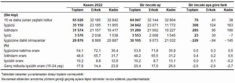 Hanehalkı İşgücü Araştırması sonuçlarına göre; 15 yaş ve üzeri işsiz sayısı 2022 yılı Kasım ayında bir önceki aya göre yaklaşık 23 bin kişi artarak 3 milyon 576 bin kişiye ulaştı. İşsizlik oranı değişmeyerek %10,2’de kaldı. Erkeklerde işsizlik oranı yüzde 8,8 olurken, kadınlarda yüzde 12,9 olarak tahmin edildi.