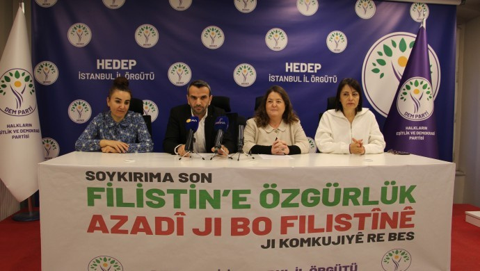 DEM Parti İstanbul İl Eşbaşkanı Gonca Yangöz, Gazze’de “soykırım” yaşandığını söyledi. Yangöz, İsrail’in Gazze’ye dönük saldırılarında yaşananlara işaret ederek, “Filistin halkı ve toprakları adeta yeryüzünden silinmek isteniyor. Tıpkı Kürt halkına yapılmak istenen gibi. Kürt halkının yaşadığı Kuzey Doğu Suriye’de ve Güney Kürdistan’da da yaşam alanları, hastaneler, tahıl depoları bombalanıyor. Demokrasi ve barış söyleminde yarışan dünya devletleri soykırıma suç ortaklığı yapıyor. Ortadoğu halklarının savaş altında yaşamasına onay veriyor ya da görmezden geliyor” ifadelerini kullandı.