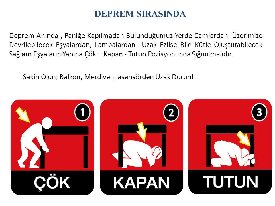 Deprem anında insanların atması gereken birkaç önemli adım vardır. Aşağıdaki maddeler, bir deprem durumunda nasıl davranacağınız konusunda size yol gösterecektir: