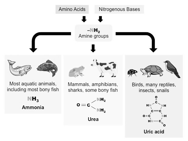 Kuşlar, sürüngenler, böcekler, kara salyangozları vb. Bazı hayvanlar azotlu atıkları ürik asit şeklinde uzaklaştırır. Tüm bu süreç minimum su kaybı ile gerçekleşir. Ürik asit diğer salgılar arasında en az toksik olanıdır.