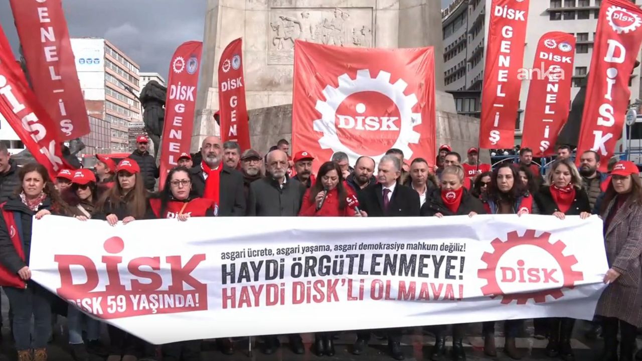 DİSK İç Anadolu Bölge Temsilciliği, konfederasyonun 59. kuruluş yıl dönümü kapsamında Ankara Ulus Atatürk Anıtı önünde basın açıklaması gerçekleştirdi. “Haydi örgütlenmeye, haydi DİSK’li olmaya” sloganıyla bir araya gelen grup, sendikal mücadelenin demokrasi için taşıdığı öneme dikkat çekti. Açıklamada, işçi sınıfının nüfusun büyük çoğunluğunu oluşturduğu ifade edilerek, örgütsüz bir toplumda iş, aş ve ekmek mücadelesinin yanı sıra demokratik değerlerin de tehditlere karşı korumasız kaldığı vurgulandı. Etkinlikte ayrıca DİSK’in kurucu genel başkanı Kemal Türkler ile Abdullah Baştürk, Rıza Kuas, İbrahim Güzelce, Mehmet Alpdündar ve Kemal Nebioğlu gibi sendikal hareketin önemli isimleri anıldı.