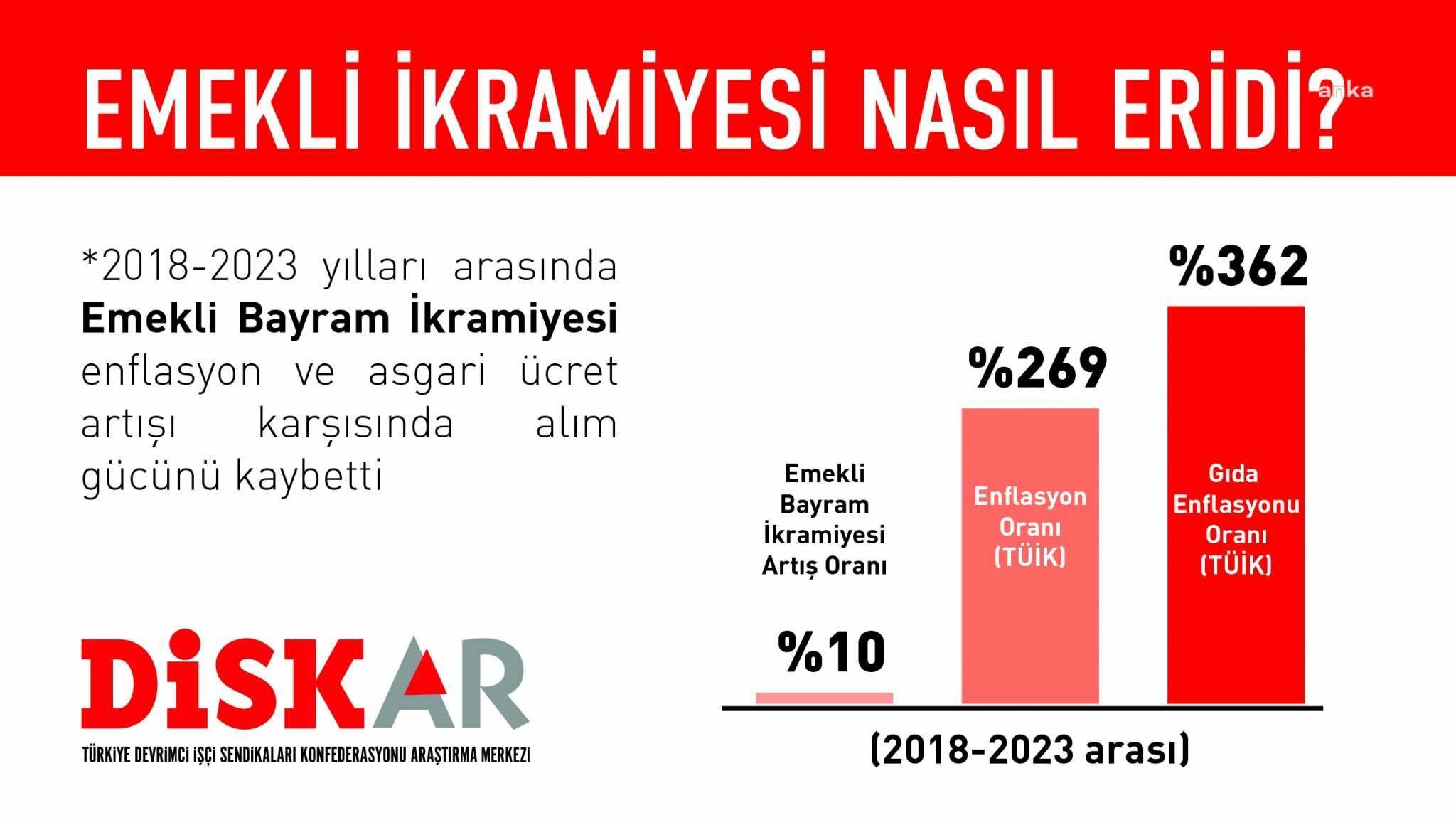 DİSK-AR bugün emeklilere bayram ikramiyesi raporunu yayınladı. Raporda, 2018-2023 arasındaki 5 yılda resmi enflasyon yüzde 269 artarken, resmi gıda enflasyonu yüzde 362 artarken, emeklilik ikramiyesi sadece yüzde 10 arttı. 2018’de 1.000 lira olarak belirlenen bayram ikramiyesi 2021’de 1.000.000 lira oldu. Emekli ikramiyesi resmi enflasyon kadar artsaydı en az 3 bin 689 lira olması gerekirdi, bu kadar artsaydı Gıda enflasyonu olarak en az 4 bin 619 lira, asgari ücret kadar arttıysa en az 5 bin 307 lira olması gerekiyor.