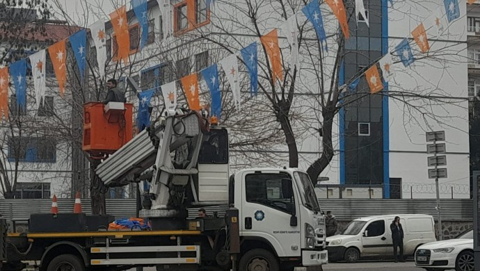 AKP’li ilçe belediye başkan adayları için bugün Sezai Karakoç Kongre Merkezi’nde yapılacak tanıtım programı öncesinde, merkezinin önündeki direklere Büyükşehir Belediyesi’ne ait vinçler kullanılarak AKP bayrakları asıldı.
