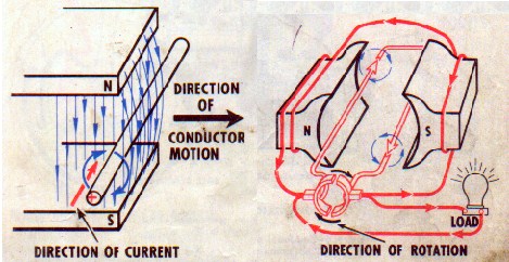 Resimde, tel kablolara sarılmış basit bir motora sahip bir jeneratör gösterilmektedir ve motor saat yönünde döndüğünde akım kırmızı oklarla gösterilen yönde akmaktadır. Endüksiyon akımının bir kısmı, uyarma bobininin etrafına sarılı bir demir külçe ile takviye edilir ve kalan akımlar bir elektrik yükü ile çıkar.