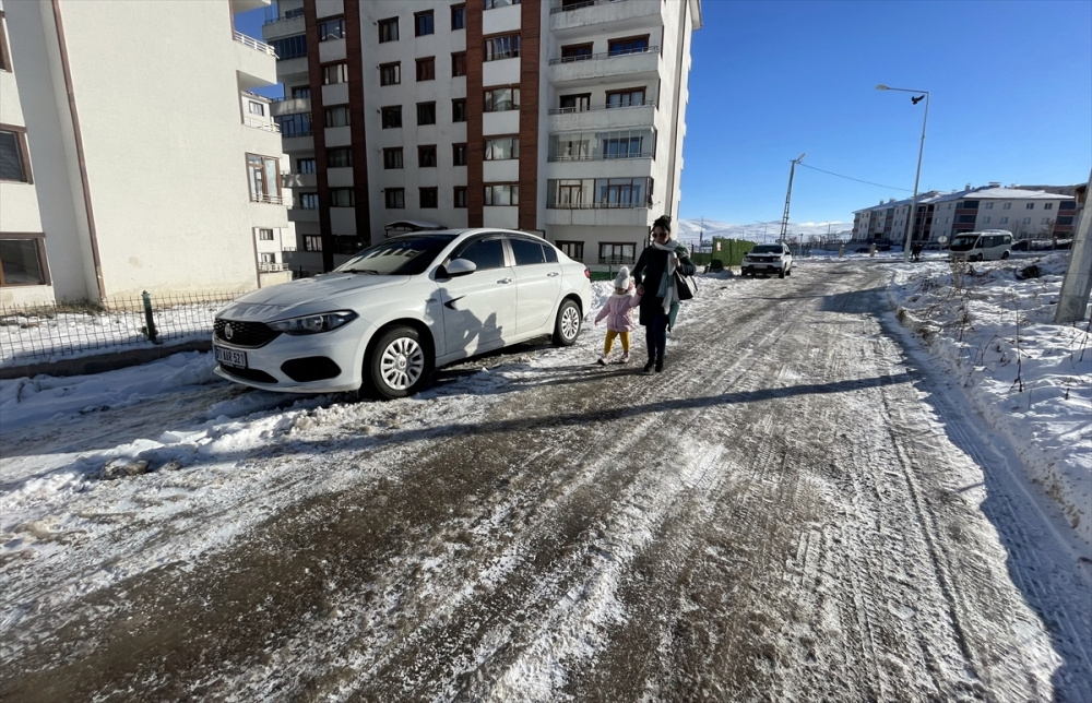 Soğuk havanın etkisiyle Erzurum’da yol ve kaldırımlarda buzlanma meydana geldi, araçların camları buzla kaplandı.