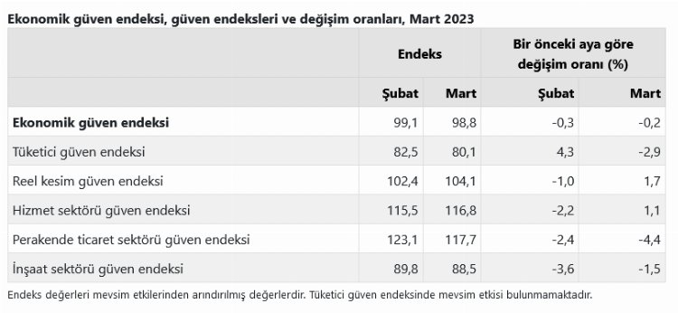 Mart ayında bir önceki aya göre Tüketici Güven Endeksi yüzde 2,9 azalarak 80,1, Perakende Ticaret Güven Endeksi yüzde 4,4 azalarak 117,7, İnşaat Güven Endeksi yüzde 1,5 azalarak 88,5 oldu.