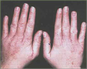 En sık dirseklerde, omuz bıçaklarının üzerinde, kalçalarda, saçlı deride ve kolların dış yüzeylerinde görülür. Karın ağrısı, karın ishali ve ishal gibi benzer bulgular yüksek glüten diyeti uygulayan hastalarda görülür. İnce bağırsak biyopsilerinde bir dereceye kadar glüten duyarlılığından kaynaklanır ve hastaların %90’ında görülür.