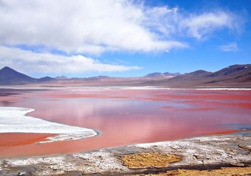 Laguna Colorada, Bolivya’nın Altiplano bölgesinde bulunan bir tuz gölüdür. Kırmızı algler ve onu çevreleyen tortu tabakası nedeniyle “Kızıl Lagün” takma adını almıştır. Gölün yüzeyi yüzen buz gibi görünse de aslında boraks ve kükürt halkalarıyla kaplıdır. Göl, aşırı tuzlu olması nedeniyle James’in flamingolarının sık uğrak yeridir.