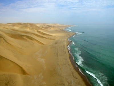 Eski Namibya çölü ile Atlantik Okyanusu’nun soğuk suları arasında beyaz bir kum alanı uzanır.