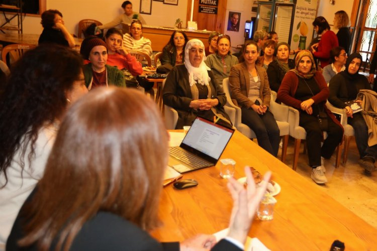 Efes Selçuk Belediye Başkanı Filiz Ceritoğlu Sengel kadınlarla birlikte söyleşiyi dinledi.
