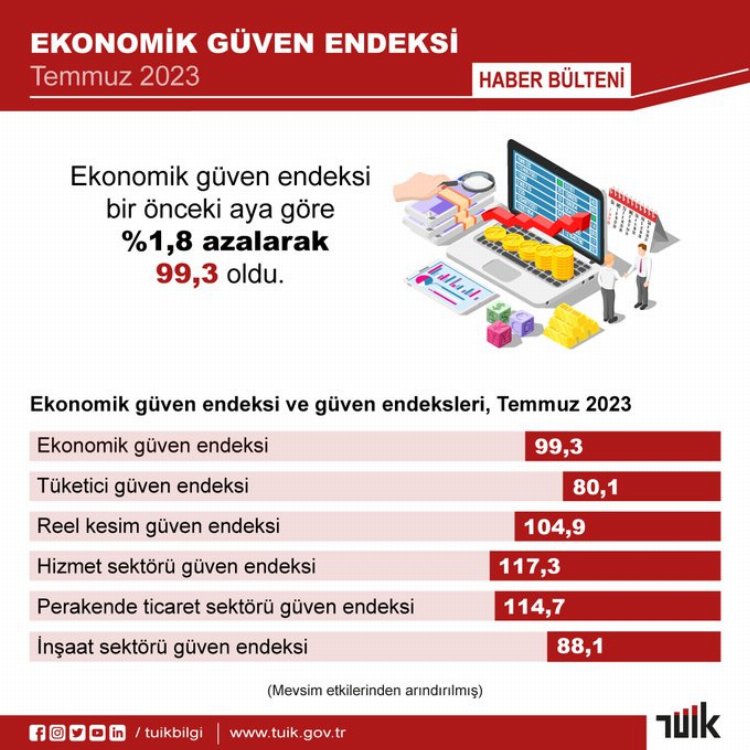TÜİK’in açıkladığı Temmuz ayı verilerine göre Ekonomik Güven Endeksi bir önceki aya göre yüzde 1,8 azalarak, endeks 99,3 oldu.
