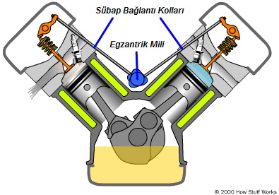 Eksantrik milinin asıl görevi, belirtildiği gibi valfleri açıp kapatmaktır. Üstten kam mili motorlarında, eksantrik mili kamları ve külbütörler doğrudan temas halindedir. Eksantrik mili rocker’ı hareket ettirir ve eksantrik mili valfleri açar. Yan eksantrik milli motorlarda, eksantrik mili kamları supap iticilerini hareket ettirir. Valf iticiler ayrıca hareketi külbütörlere iletir ve külbütör kolları valfi açar.