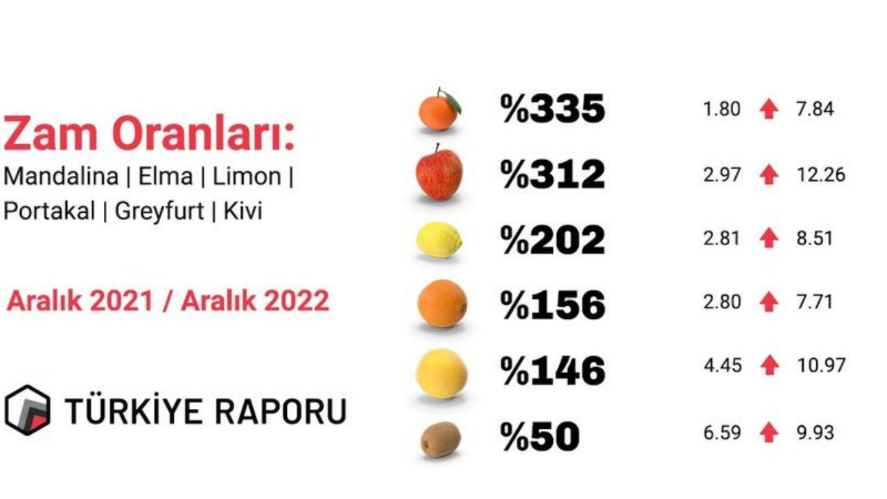 Öte yandan portakal fiyatları yüzde 156 arttı. Aralık 2021’de 2,80 TL olan portakalın fiyatı bu ay itibarıyla 7,71 TL oldu.