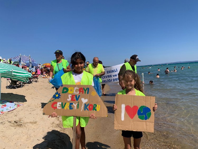 ERÇED üyeleri daha sonra dernek logolu yelekleri ile Erikli Sahili’ne giderek, sahilde temizlik çalışması yapmanın yanı sıra sahildeki tatilcileri de etkinliğe katılmaya ve sahilden kalkarken çöplerini poşede koyarak almalarını istedi.