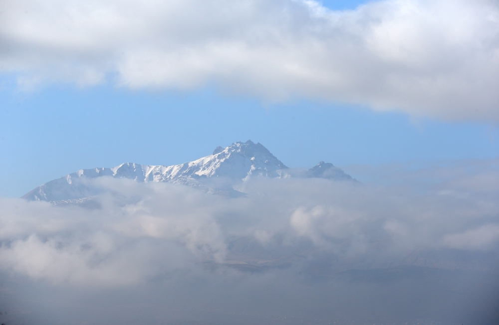 Şehrin sembolü Erciyes Dağı, etrafını çevreleyen sis tabakasıyla güzelliğine güzellik kattı. (AA)