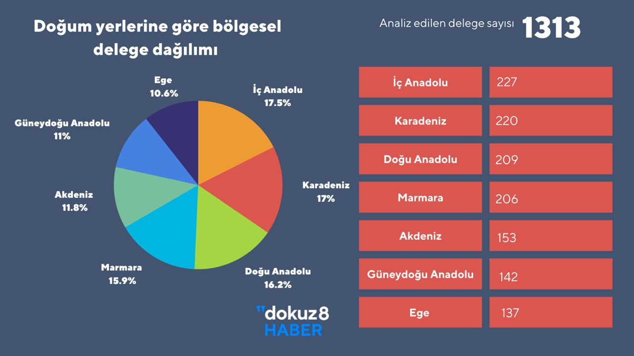 Tüm delegelerin doğum yerlerine göre bölgesel dağılımına bakıldığında da delegasyon içinde bölgesel temsiliyet oranlarına ilişkin son dönem tartışmalarına ışık tutacak veriler ortaya çıkıyor. Verilere göre CHP Kurultay delegasyonunun bölgesel dağılımda İç Anadolu ve Karadeniz öne çıkıyor.