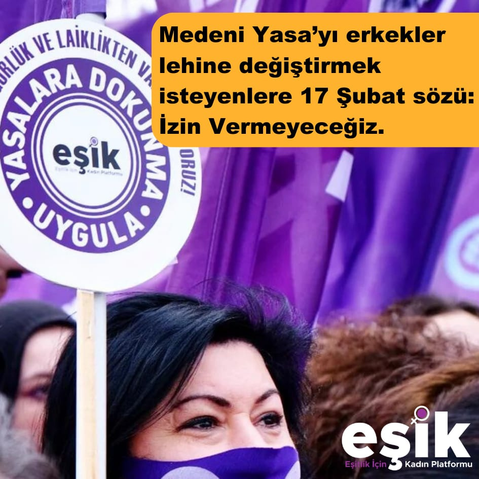 Yasada düzenlemeler yapılacağına değinen EŞİK, “Medeni Yasa’yı erkekler lehine değiştirmek isteyenlere 17 Şubat sözü: İzin Vermeyeceğiz.” dedi.