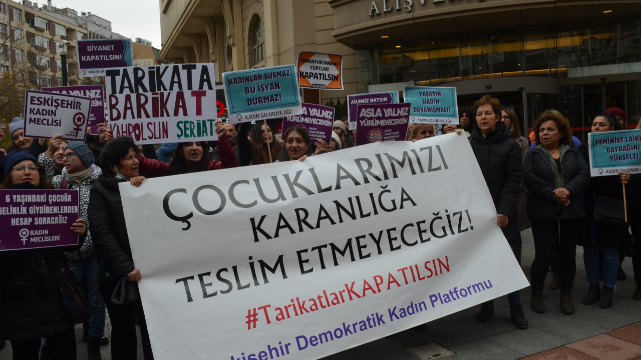 İsmail Ağa cemaatine bağlı Hiranur Vakfı’nın 6 yaşındaki kızı HKG’nin 6 yaşındaki kızının imam nikahına kıymasıyla başlayan tepkiler ve sonraki gelişmeler cemaatin daha geniş kesimleri tarafından öğrenildi. . Toplum, devam ediyor. Eskişehir’de bugün saat 14.00’te İsmet İnönü 1 Caddesi Kanatlı AVM önünde toplanan Eskişehir Demokratik Kadın Platformu unsurları, basın açıklaması yaparak tepkilerini gösterdi. Platform adına açıklamayı Özden Yücel okudu. “Sizin karanlığınıza boyun eğmeyeceğiz!” Basın açıklamasında şunlar belirtildi: