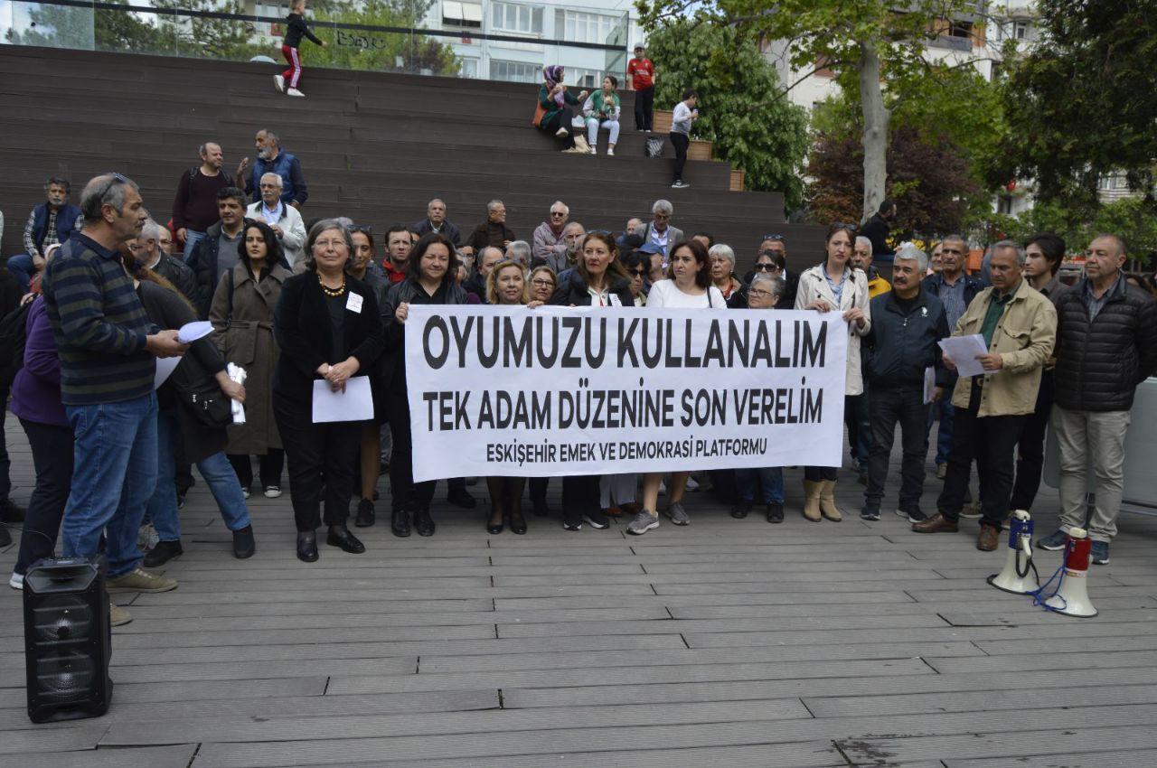 Eskişehir Emek ve Demokrasi Platformu adına açıklamayı okuyan Nazan Aksaray, ülkede 14 Mayıs’ta seçimlerin eşit ve haksız koşullarda yapıldığını hatırlattı. Cumhur İttifakı’nın devletin bütün imkanlarını kullandığını; Yalan, iftira, baskı ve korkutma yöntemlerini denediğini bu nedenle şu ifadeleri kullandığını söyledi: