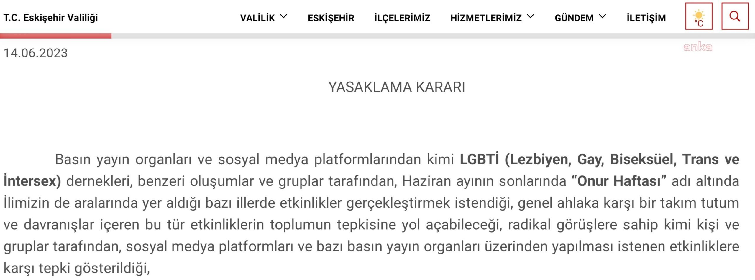 Eskişehir Valiliği, kentte ‘Onur Ayı’ kapsamında düzenlenecek etkinliklerin asayişi bozma ve provokasyon olabileceği gerekçesiyle 30 gün süreyle yasaklandığını duyurdu. Böylece ; Kentte yarından itibaren herhangi bir gösteri, yürüyüş, kutlama ve şenlik yapılmayacak.