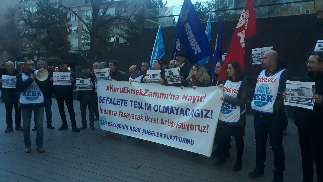 KESK şube platformunun daveti üzerine bugün saat 17.30’da Eskişehir Hamamyolu Yediler Parkı girişinde toplanan KESK üyesi sendika üyeleri, “Halkın bütçesi çalışmak için, yoksulluk sınırının üzerinde maaş talep ettiler. Hayat pahalılığıyla yüzleşen maaşlarının eriyip gitmesine tepkilerini dile getiren temsilcilerinin platformu adına açıklamalarda bulunan Uygar Kurtçu’nun açıklamaları şöyle:
