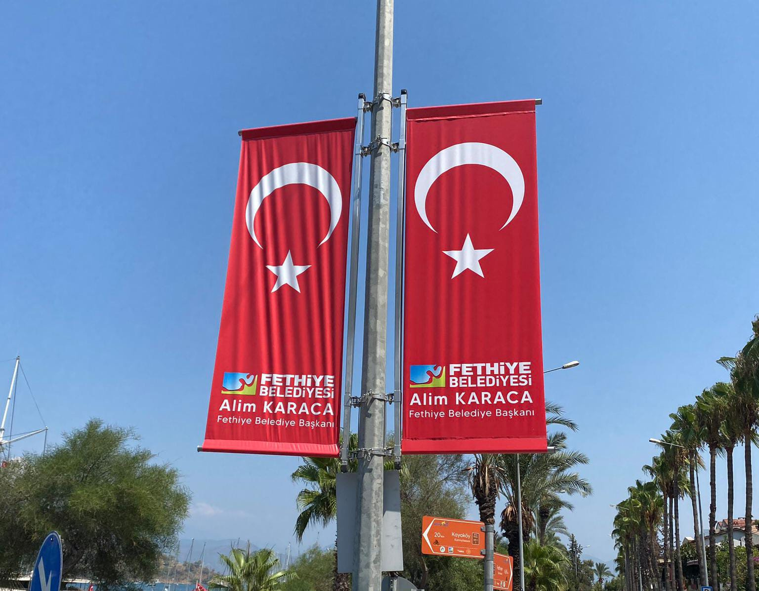 Muğla Valiliği’nden yapılan açıklamada, ilçede ana caddelerdeki elektrik direklerinde bulunan reklam panolarına bayrak üzerinde belediye başkanının adı ile Fethiye Belediyesi logosunun yer aldığı görsellerin asıldığının tespit edildiği bildirildi.