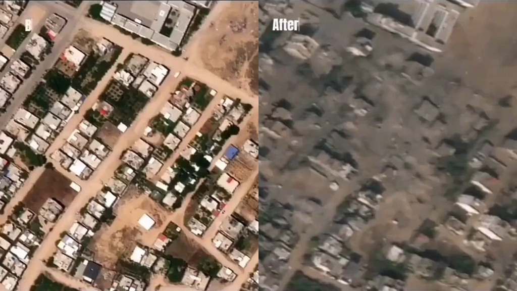 7 Ekim’de başlayan çatışmalarda İsrail’in işgal altındaki Gazze’ye yaptığı saldırılar sonucunda ortaya çıkan yıkımın havadan görüntülenmiş ‘öncesi ve sonrası’ fotoğraflarda kentte yaşanan yıkımın gözler önüne seriliyor.