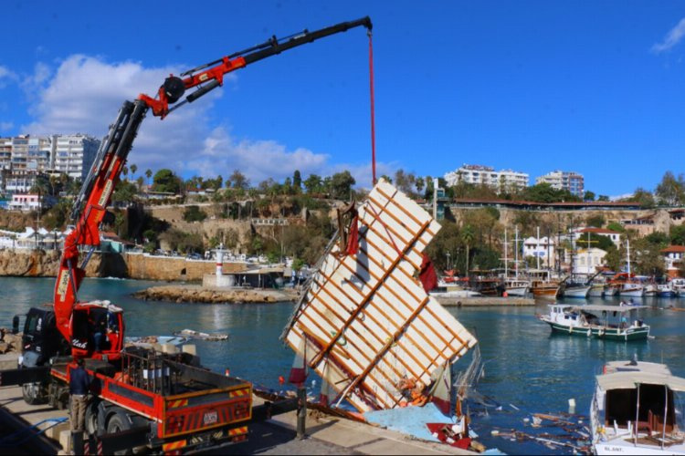 Antalya Büyükşehir Belediyesi Çevre Koruma ve Kontrol Dairesi Başkanlığı’na bağlı Atık Yönetimi ve İşletmeler Şube Müdürlüğü ekipleri dev dalgaların etkisiyle parçalarına ayrılıp sular altında kalan teknelerin enkazlarını vinç ve iş makineleri yardımıyla denizden çıkarttı. Denizin içinden çıkartılan tekne enkazları kamyonlara yüklenerek götürüldü.