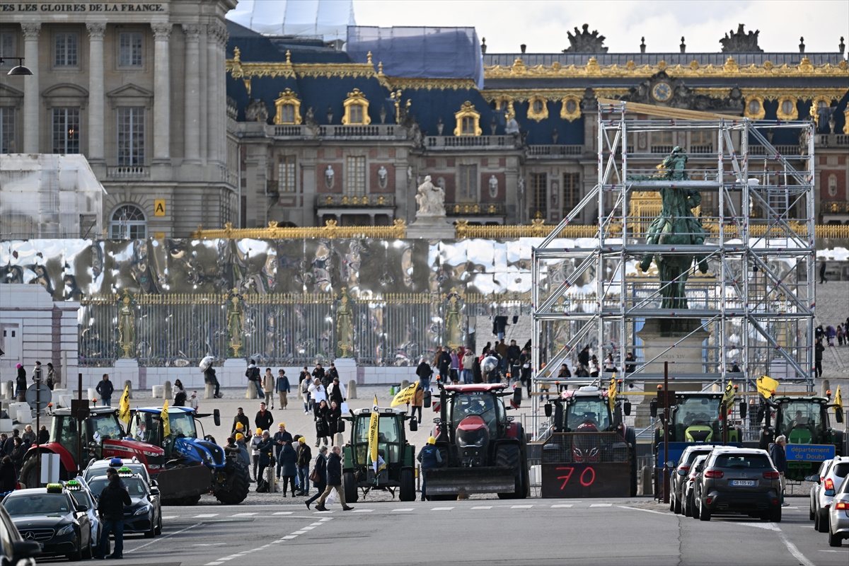 Çiftçiler, traktörlerini sıra halinde tarihi Versay Sarayı’nın önüne park etti. Eylemciler, traktörlerinin üzerine sendikalarının ve Fransa’nın bayrağını astı.