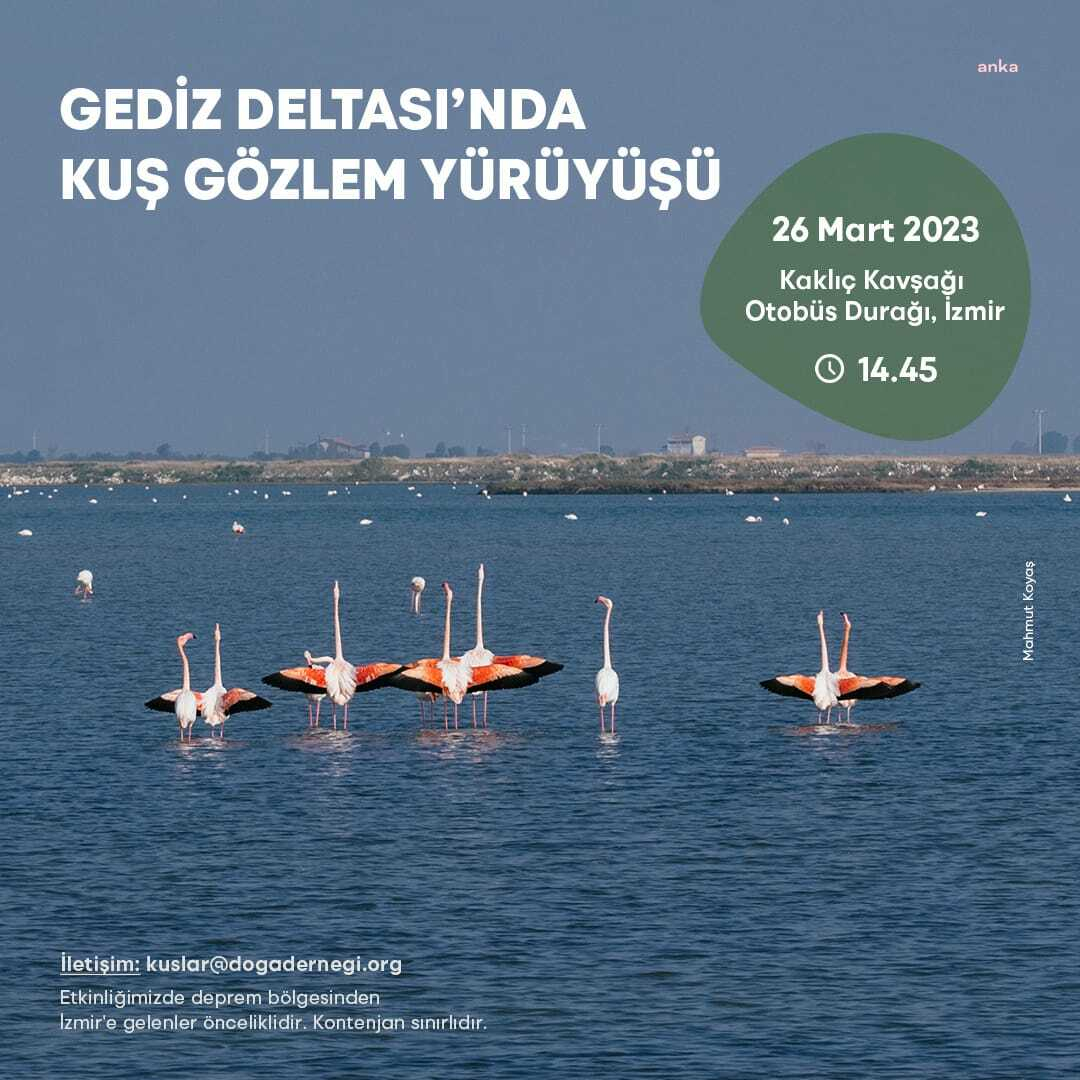 Türkiye’nin en önemli doğal bölgelerinden biri olan Gediz Deltası’nda 26 Mart’ta kuş gözlem mitingi yapılacak. İzmir Büyükşehir Belediyesi ve Doğa Derneği tarafından düzenlenen ücretsiz etkinliğe katılmak isteyenler [email protected] adresinden kayıt yaptırmalıdır. Öncelik depremden zarar gören İzmir’e gelen ailelere verilecek olup, katılım sınırlı sayıda olacaktır. Katılımcılar saat 14.45’te Kaklıç Kavşağı Otogarı’nda buluşacak ve toplu olarak Delta’ya transfer olacak.
