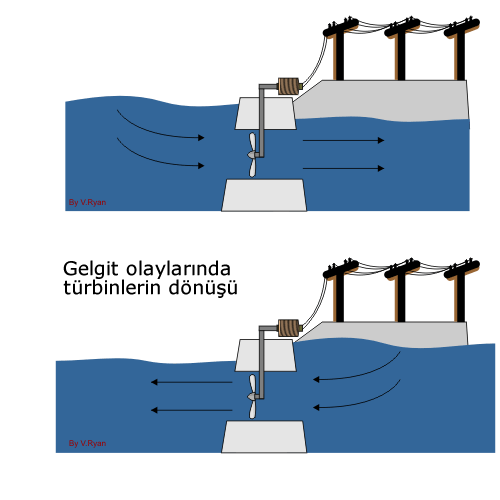 Ortalamada su yükselir, türbinden geçer ve barajı doldurur. Gelgit döneminde barajdaki su tekrar türbinlerden geçerek denize geri döner. Bu olaylar sırasında türbinler çalışırken elektrik üretilir.