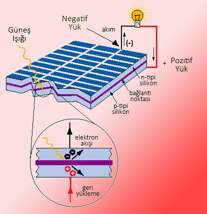Güneşten gelen fotonlar yeterli enerjiye sahip bir silikon hücreye çarptığında, silikon tabakadan bir elektron kopararak geride bir boşluk bırakabilirler. Böylece negatif yüklü elektron ve geride kalan pozitif yüklü boşluk serbestçe hareket edebilir. Ancak P/N bağlantısındaki elektrik yükleri sayesinde yalnızca bir yönde hareket edebilirler. Serbest elektron n tarafına ve delik p tarafına doğru çekilir.