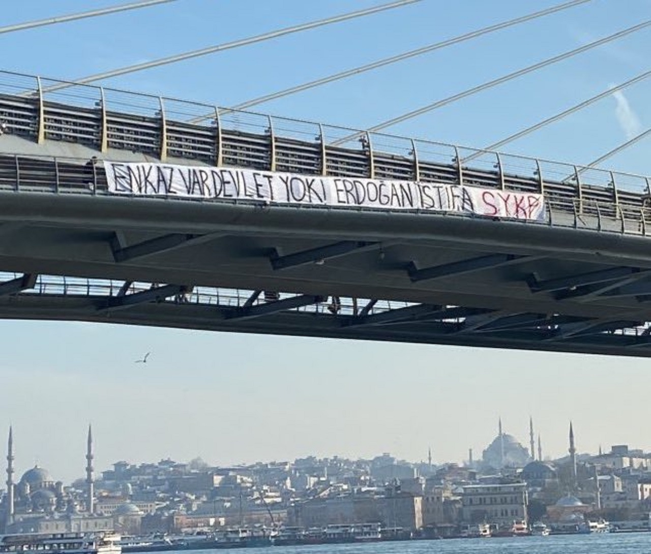 Fenerbahçe ve Beşiktaş taraftarlarının “hükümet istifa” sloganları atmasının ardından Sosyalist Yeniden Kuruluş Partisi İstanbul İl Teşkilatı Haliç Köprüsü’ne pankart astı.