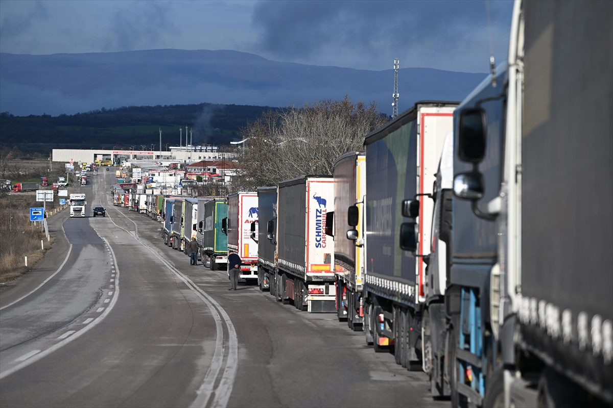 Hamzabeyli Sınır Kapısı’nda Avrupa’ya geçiş için yüzlerce tır sürücüsü araçlarında bekleyişlerini sürdürüyor.