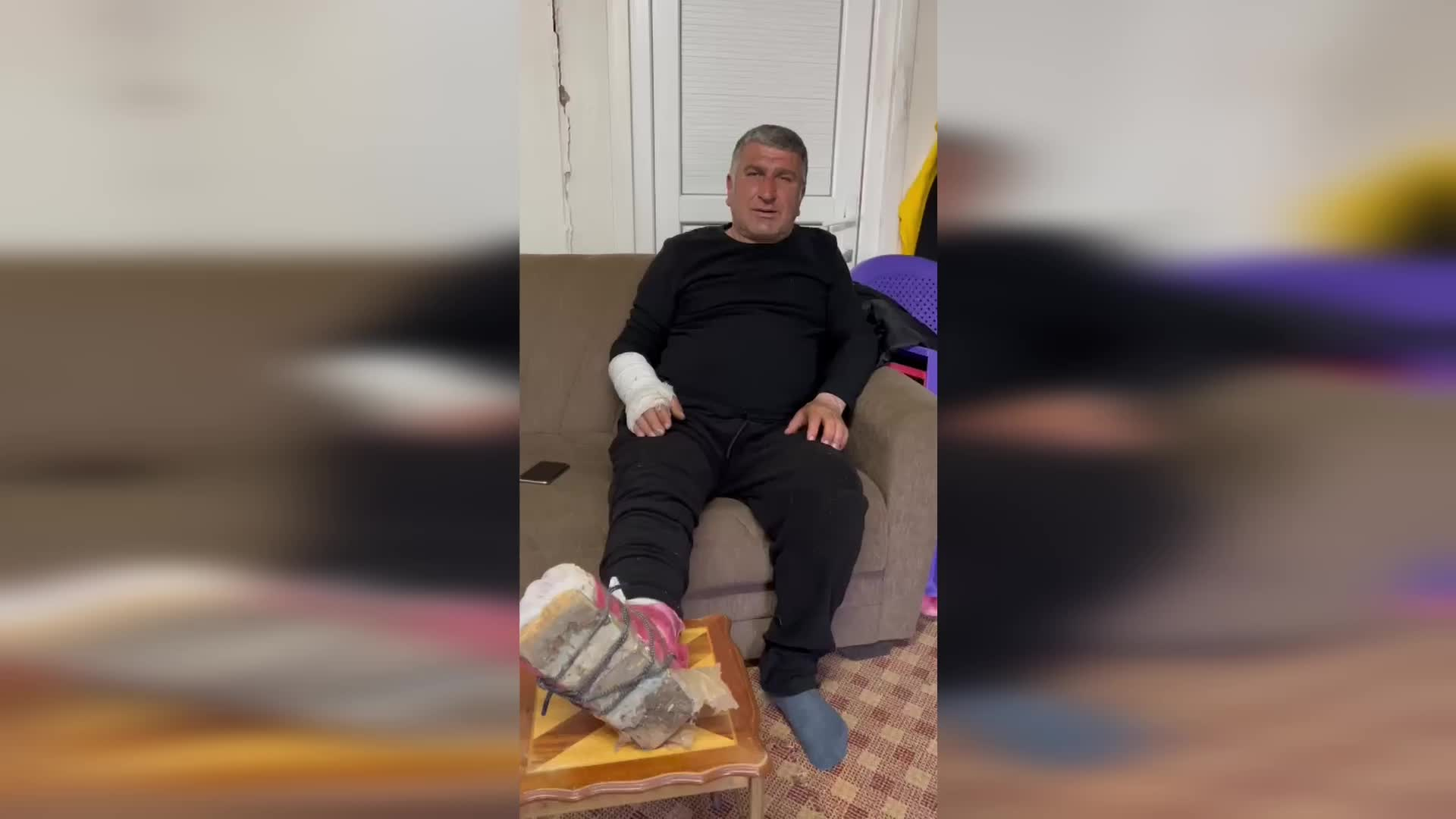 “Depremin ilk saatlerinde çıktık. Saat beş gibi bir kişiyi kurtardık. İşte o zaman ayaklarım çoktan oradaydı. Başparmağım kırıldı sandım. Yedinci güne kadar sürekli kurtarma çalışmasına başladık ve 7. gün ilçe muhtarımız doktora götürdü ayağım kolum kırıldı o süreçte çalışmalarımız devam etti 2 kez ayağıma alçı koydular sudan eridi ve kar.Şimdi gördüğünüz gibi panoyu bağladık ve çalışmalarımıza devam ediyoruz.”
