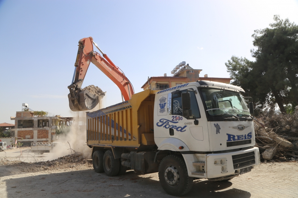 Çıkan molozlar, kamyonlara yüklenerek enkaz döküm alanlarına götürüldü. (AA)