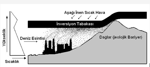 Bu tür hava trafiğinin tersine dönmesi, ılık deniz melteminin karaya ulaşmadan önce soğuk hava akımlarını aştığı sahillerde (şehirlerde), yüksek basıncın olduğu günlerde, sakin ve açık hava koşullarında meydana gelir. Bu durumlarda, zemin seviyesinde daha soğuk hava tabakasının üstünde bir sıcak hava tabakası bulunur. Stabilize (stabil) tabaka olarak adlandırılan inversiyon tabakası, bir örtü görevi görerek bacadan veya egzozdan atılan kirleticileri tabakanın altında hapseder ve biriktirir. Bu tür yansıma oluşumunun örnekleri Şekil 4’te verilmiştir.