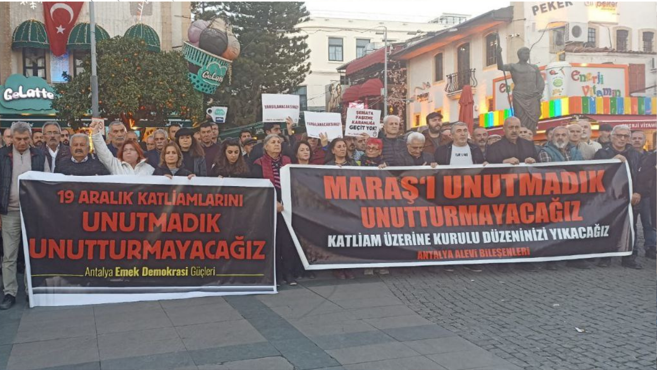 Antalya Emek ve Demokrasi Güçleri adına konuşan İHD Antalya Şubesi Yönetim Kurulu Üyesi Av. Ulaş Ertaş “ Eğer bu katliamlarla yüzleşilmiş, sorumluları ortaya çıkarılmış ve hesabı sorulmuş olsaydı, bugün burada sessizce acımızı paylaşıyor ve kaybettiğimiz canlarımızı anıyor olacaktık. Ancak bu katliamların üstleri örtülmüş, gerçek sorumluları ortaya çıkarılmamış, hatta ödüllendirilmişlerdir. Bu nedenle, aynı zamanda öfkemizi ifade etmek için buradayız” dedi