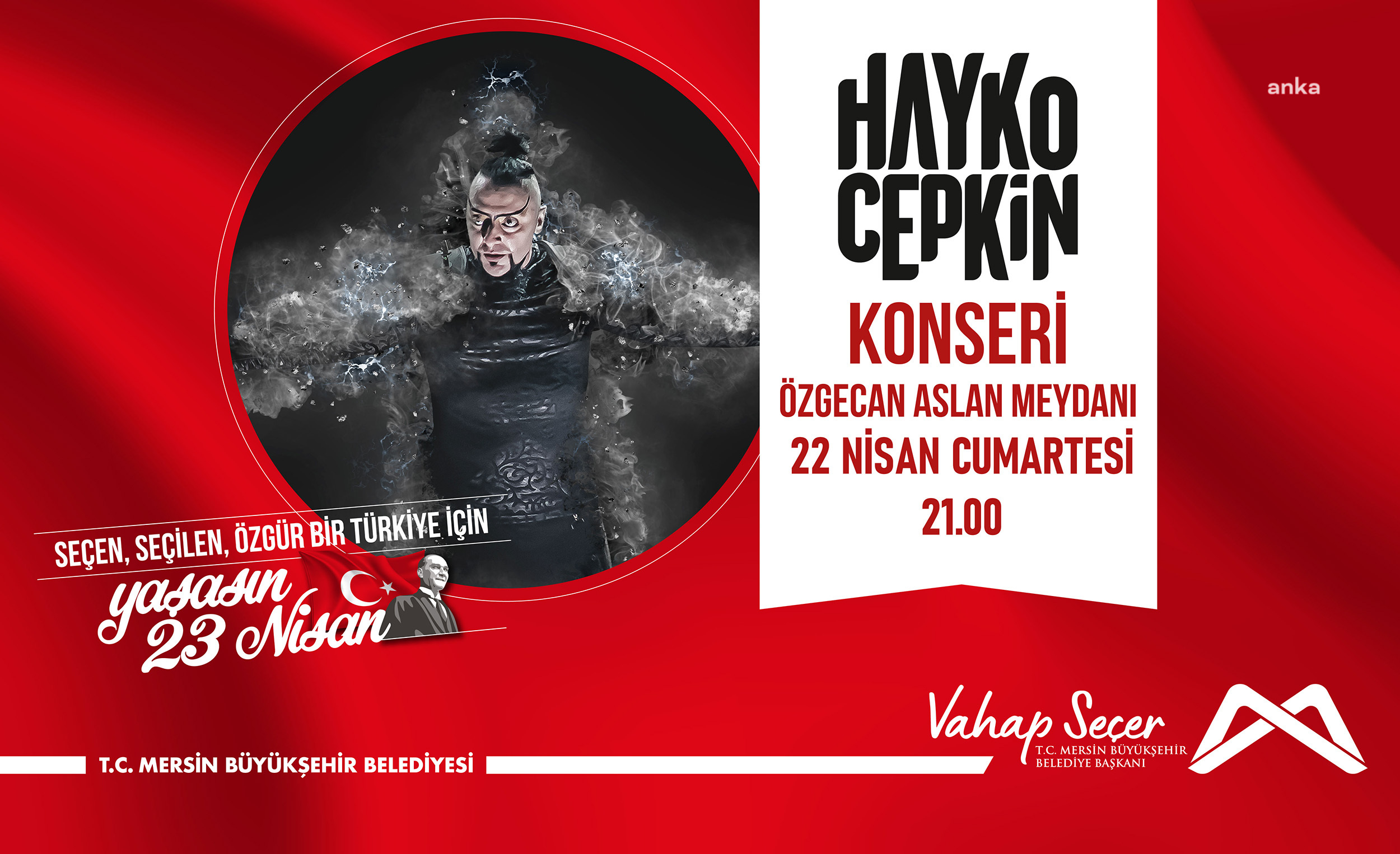 Mersin Büyükşehir Belediyesi, 23 Nisan Ulusal Egemenlik ve Çocuk Bayramı’nın 103. Yıldönümü kutlamaları kapsamında Mersinlilerin ve kentte yaşayan depremzedelerin moralini yükseltmek ve motive etmek amacıyla Hayko Cepkin konseri düzenliyor.