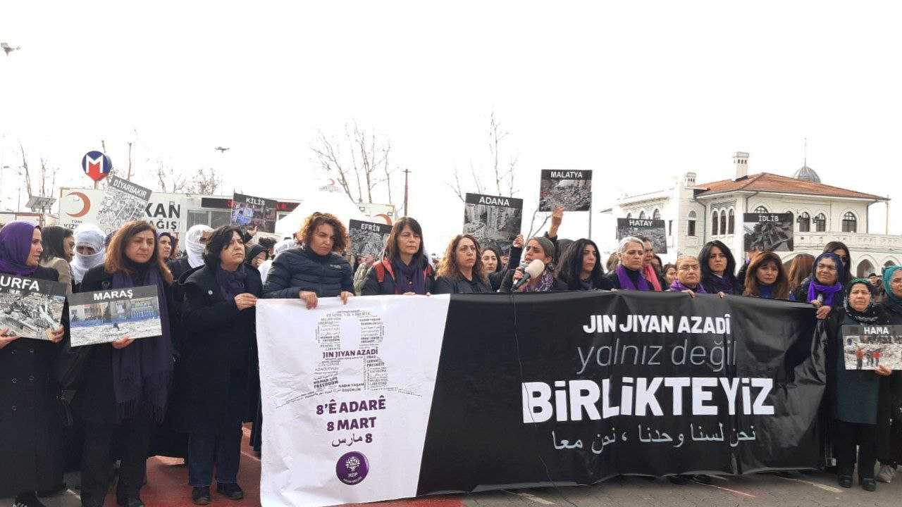 Halkların Demokratik Partisi Kadın Kolları Sözcüsü Ayşe Akar Paşaran yaptığı basın açıklamasında, depremin ardından günlerce devletin müdahale etmediğini ve yardım yapmadığını söyledi. Gösterilen dayanışmaya dikkat çeken Başaran, “Bu süreçte yalnız değiliz, kendi gücümüzle bir arada duracağız ve teşkilatımızla 8 Mart’ta sokaklarda olacağız. Tüm camia bu süreçten etkilendi. Ancak her zaman olduğu gibi bu krizden en çok kadınlar, çocuklar ve diğer dezavantajlı grupların etkilendiğini gördük. bu afete kadar ise hükümetin barınma ve hijyen sorununu çözemediği için büyük zorluklarla karşılaştılar.Genel Su, ısınma ve yiyecek.