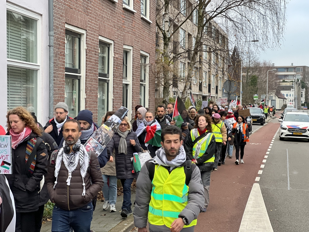 Leiden tren istasyonunda toplanan yüzlerce kişi, Filistin’e destek için idari başkent Lahey’deki UCM binasına yürüdü.