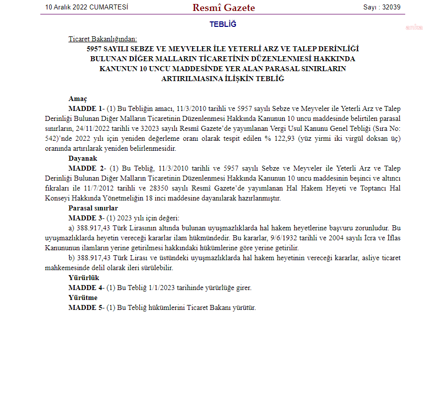 Sebze ve meyve üreticileri ile tüccarları arasındaki uyuşmazlıklarda, hakem heyetinin Asliye Ticaret Mahkemesi’nde delil olarak sunulmak üzere vereceği kararın parasal sınırı yüzde 122,93 artırılarak 388 bin 917,43 lira olarak belirlendi.