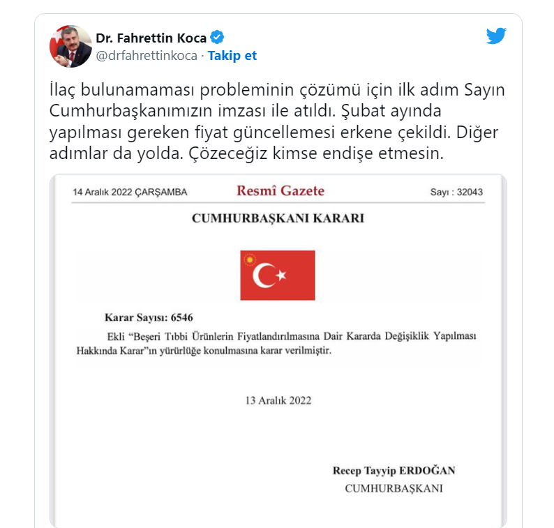 Sağlık Bakanı Fahrettin Koca, Resmi Gazete’de yayımlanan Cumhurbaşkanı kararıyla ilgili olarak, “Cumhurbaşkanımızın imzasıyla ilaç bulunamaması sorununun çözümü için ilk adım atıldı. Şubat ayında yapıldı, ertelendi. Yolda başka adımlar var. Onu da çözeceğiz, merak etmeye gerek yok.”