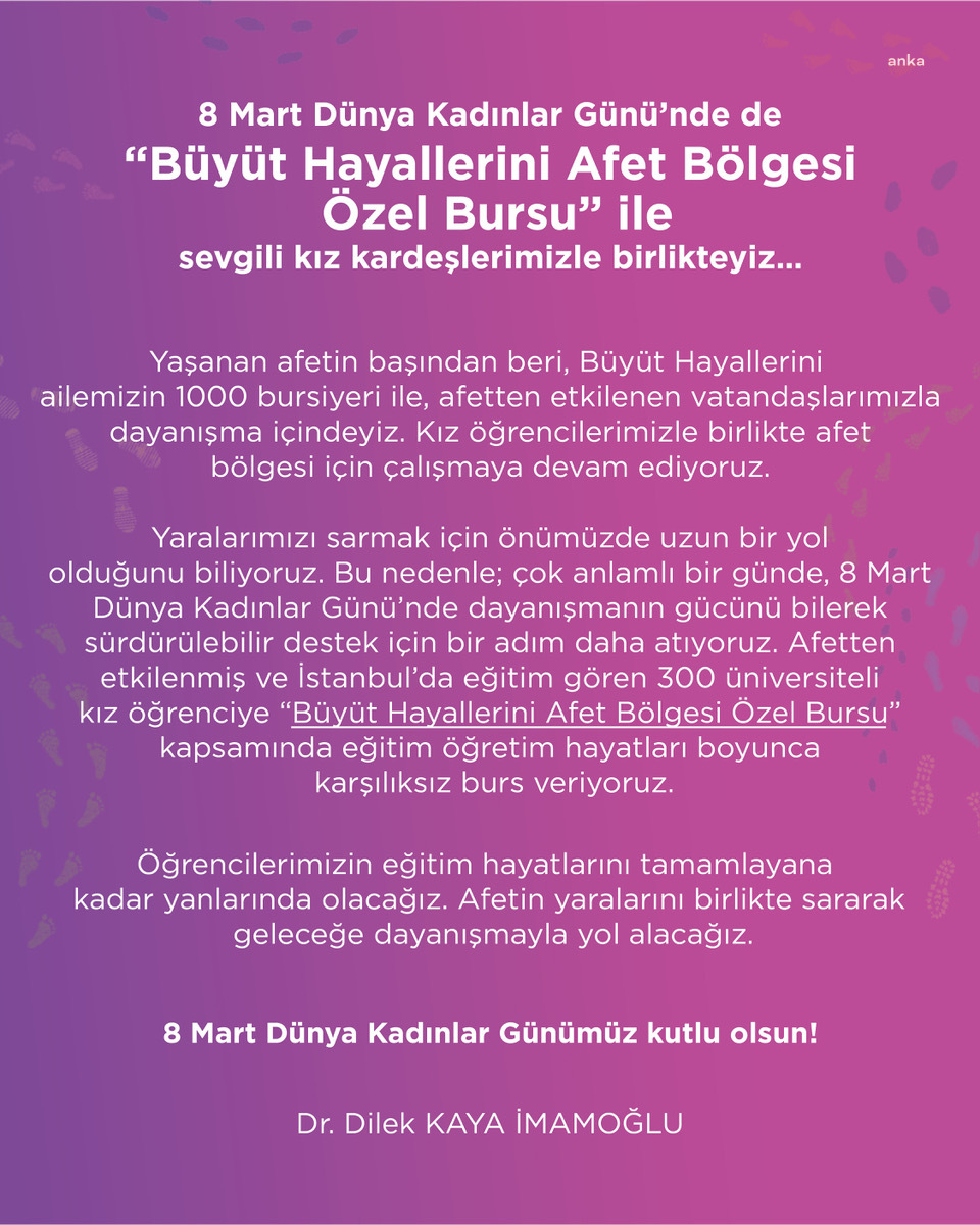 İstanbul Büyükşehir Belediyesi’nin (İBB) “İstanbul Vakfı” çatısı altında görev yapan Dr. Dilek Kaya İmamoğlu liderliğinde hayata geçirilen “Hayallerini Büyüt” projesi kapsamında üniversitede okuyan 300 depremzedeye özel burs sağlanacak.
